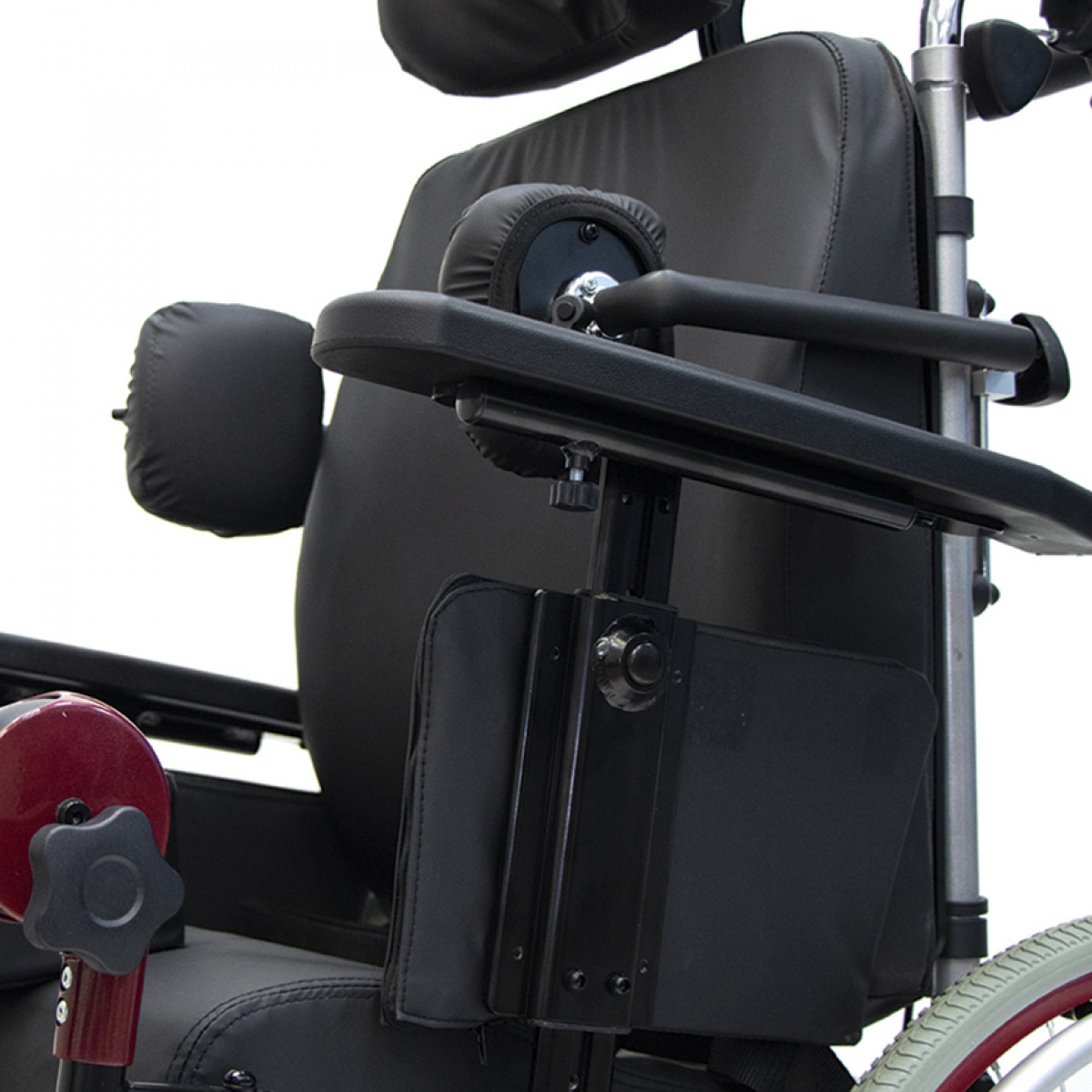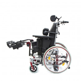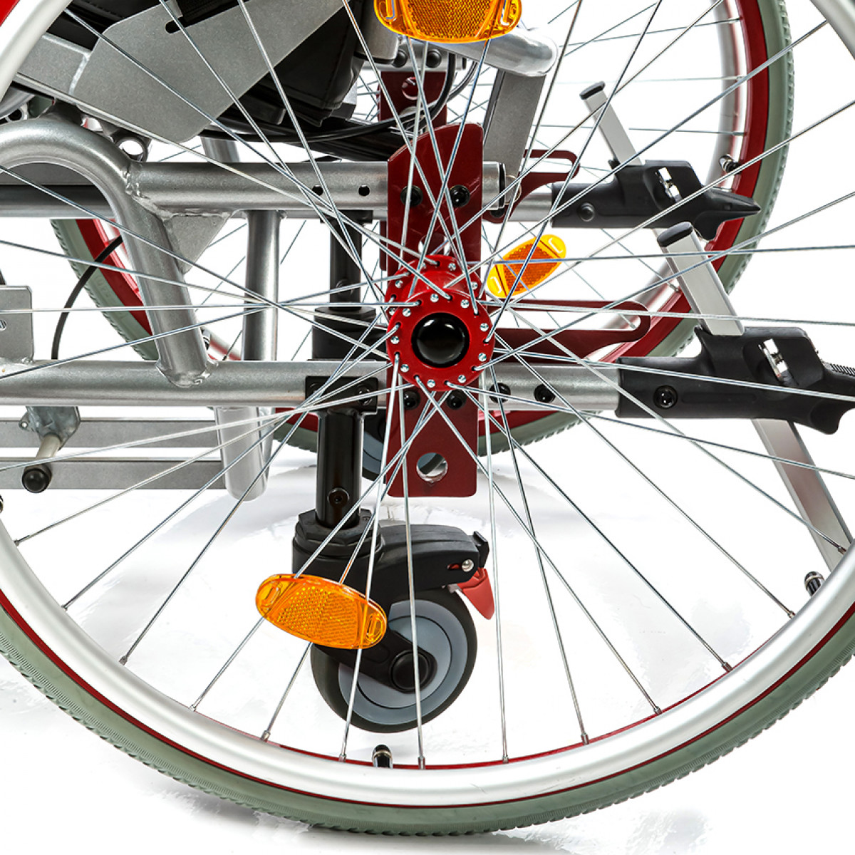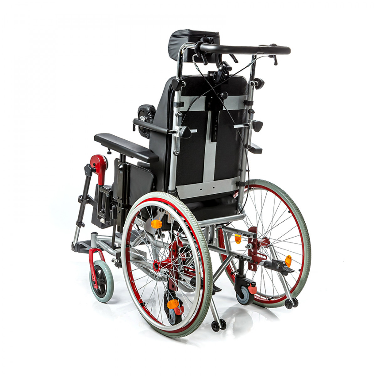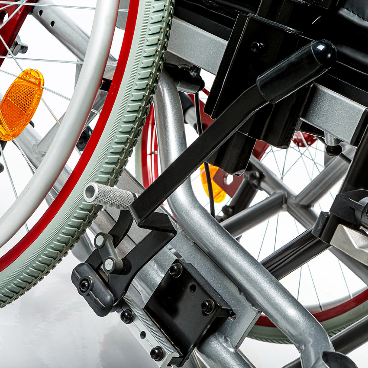 Подножки регулируются по высоте и углу наклона, оснащены мягкими ложементами и упорами для коленей для дополнительной фиксации. Раздельные опоры для стоп можно настроить по положению. Передние и задние колёса доступны в вариантах: цельнолитые или пневматические — под разные условия эксплуатации. Для устойчивости предусмотрены антиопрокидыватели с регулировкой по высоте. Прочная алюминиевая рама с антикоррозийным покрытием рассчитана на длительное использование.