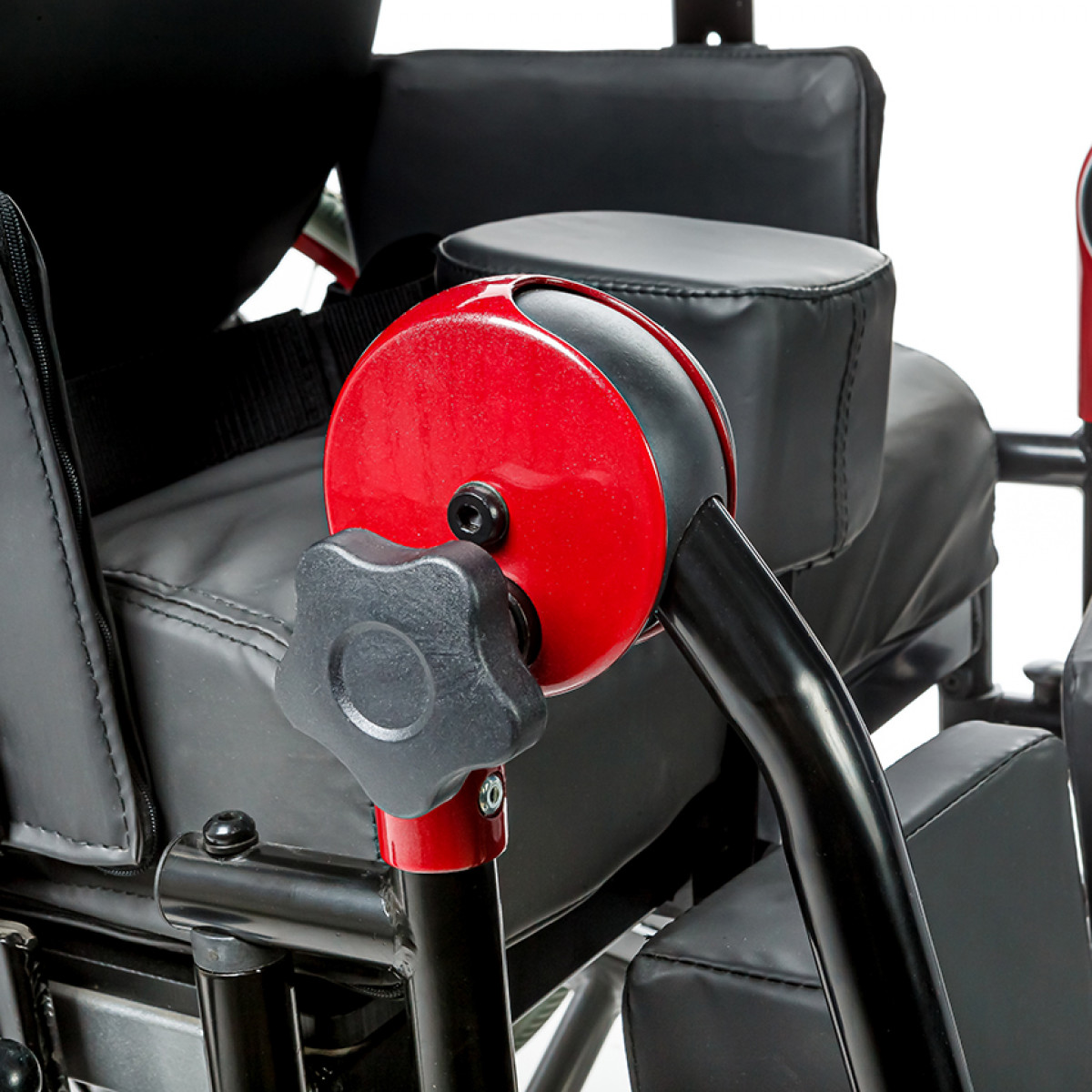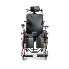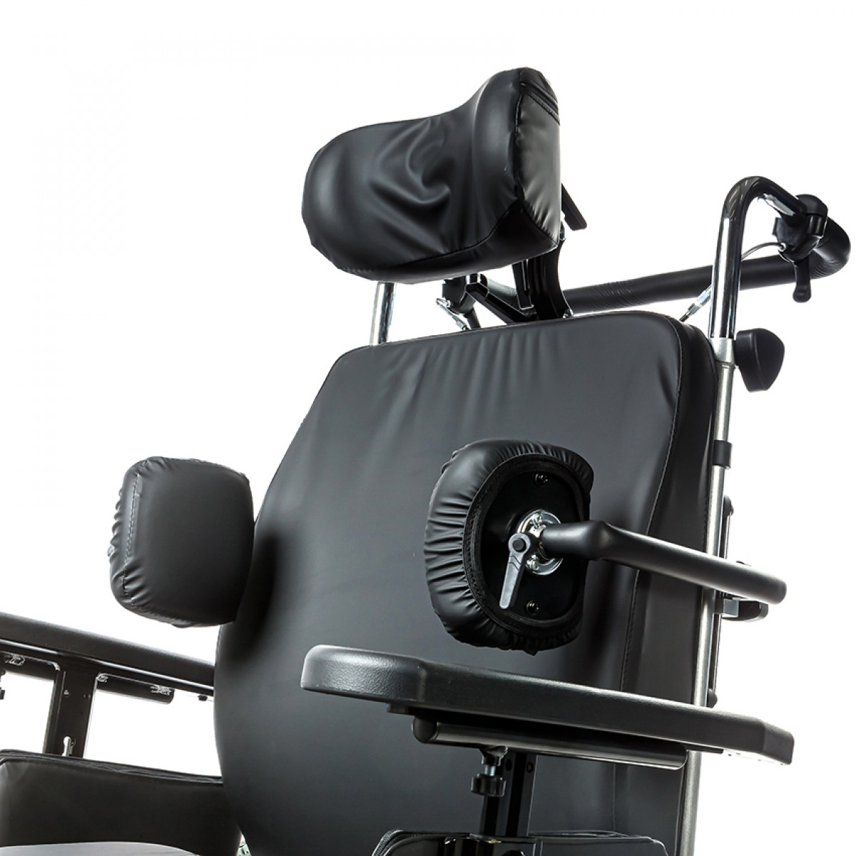 Коляска позволяет точно настроить посадку: спинка регулируется по высоте и углу наклона и оснащена боковыми фиксаторами для поддержки корпуса. Сиденье настраивается по высоте, глубине и наклону, а подлокотники регулируются и при необходимости снимаются для удобного пересаживания. Ручки для сопровождающего также регулируются по высоте, что делает управление комфортнее.
