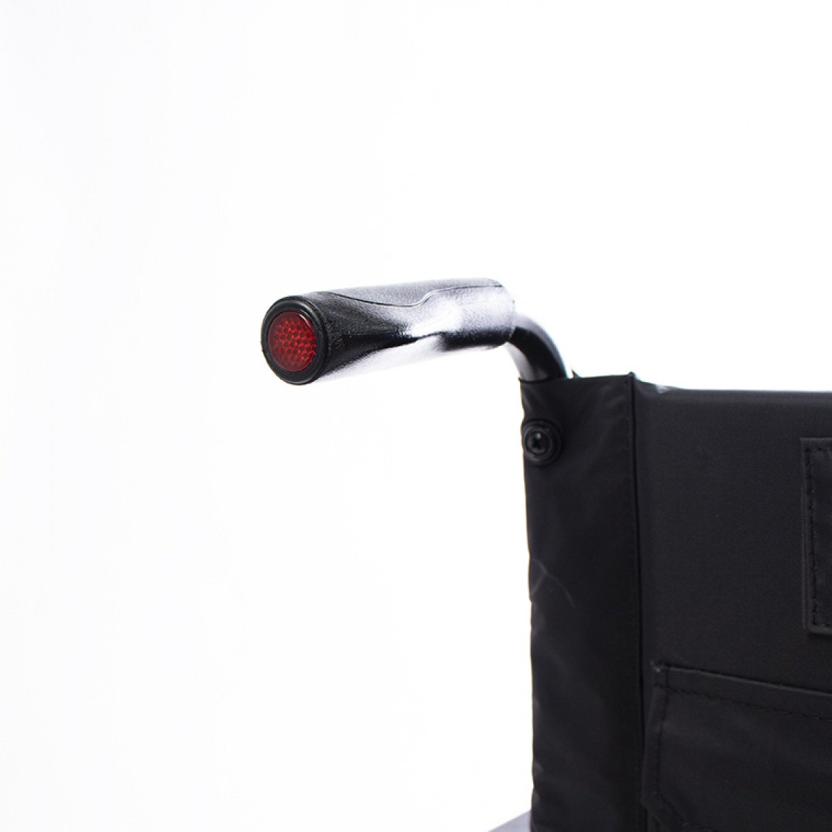 Складная рама облегчает хранение и транспортировку. Для устойчивости предусмотрен антиопрокидыватель на роликовой опоре, а ручки для сопровождающего оснащены светоотражателями — это повышает безопасность при передвижении в тёмное время суток.