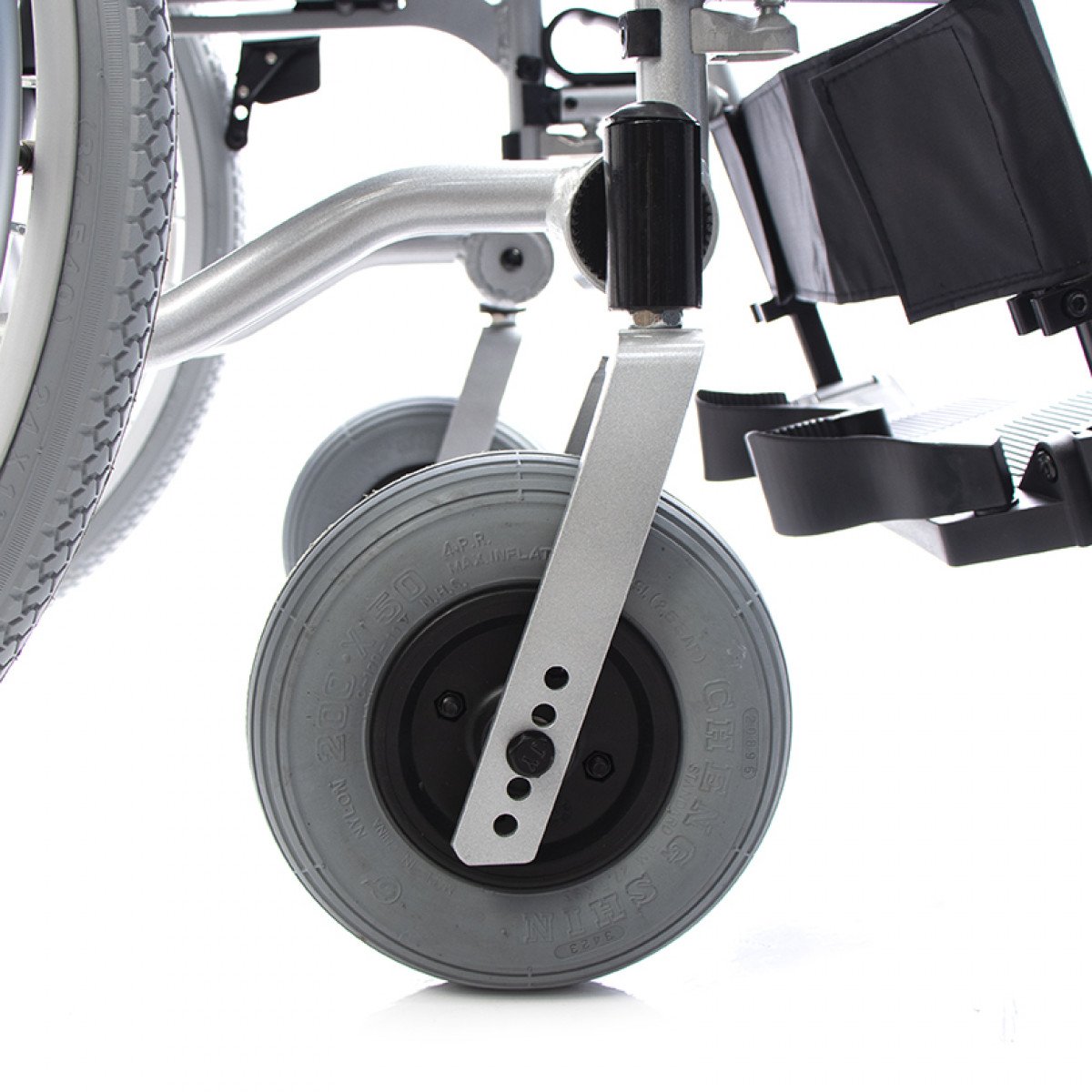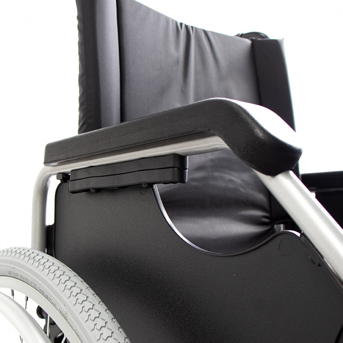 Коляска настраивается под индивидуальные потребности: спинка и подножки регулируются по высоте, а приводное колесо с двойным ободом можно установить с удобной стороны. Приводные колёса также регулируются по положению, что помогает точнее настроить посадку. Откидные подлокотники с регулировкой упрощают пересаживание и делают использование более комфортным.