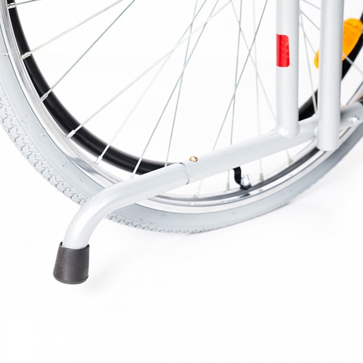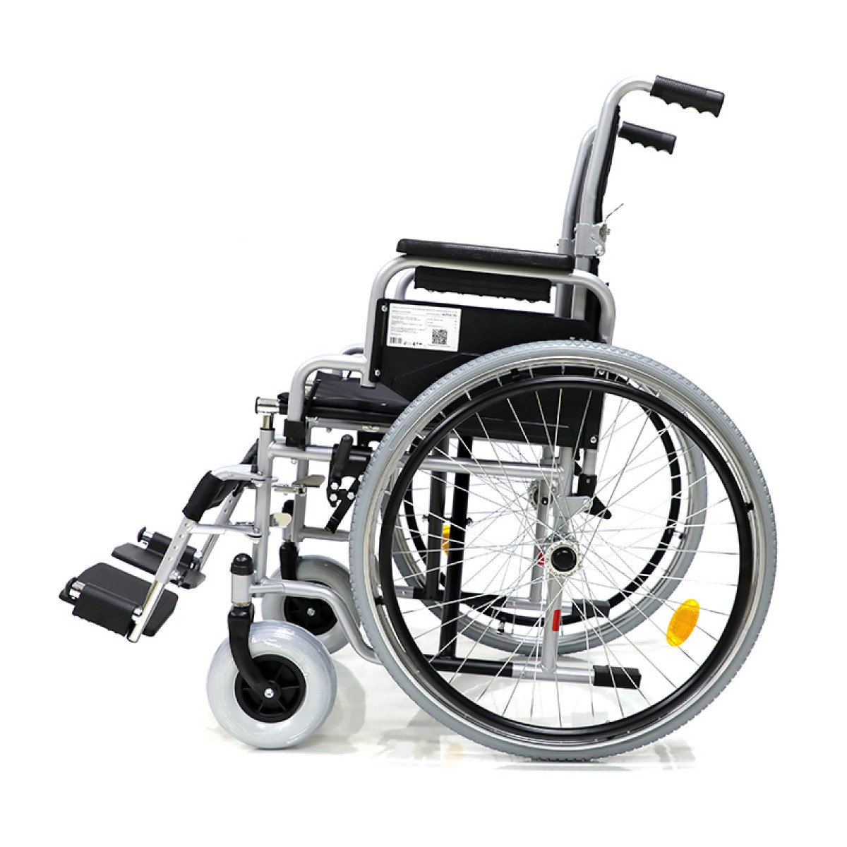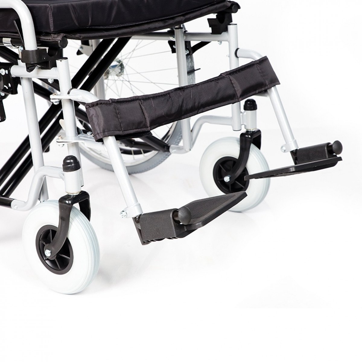 Задние колёса оснащены кнопочной системой быстрого снятия и доступны в двух вариантах: цельнолитые или пневматические. Обода с антискользящим покрытием облегчают управление, а стояночные тормоза с регулировкой глубины установки повышают контроль и безопасность. Подножки регулируются по высоте, снимаются или откидываются — это упрощает пересаживание и делает коляску более компактной при транспортировке.