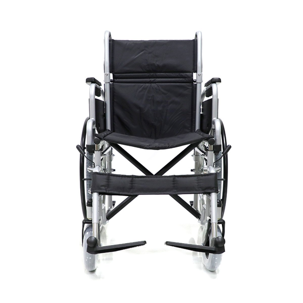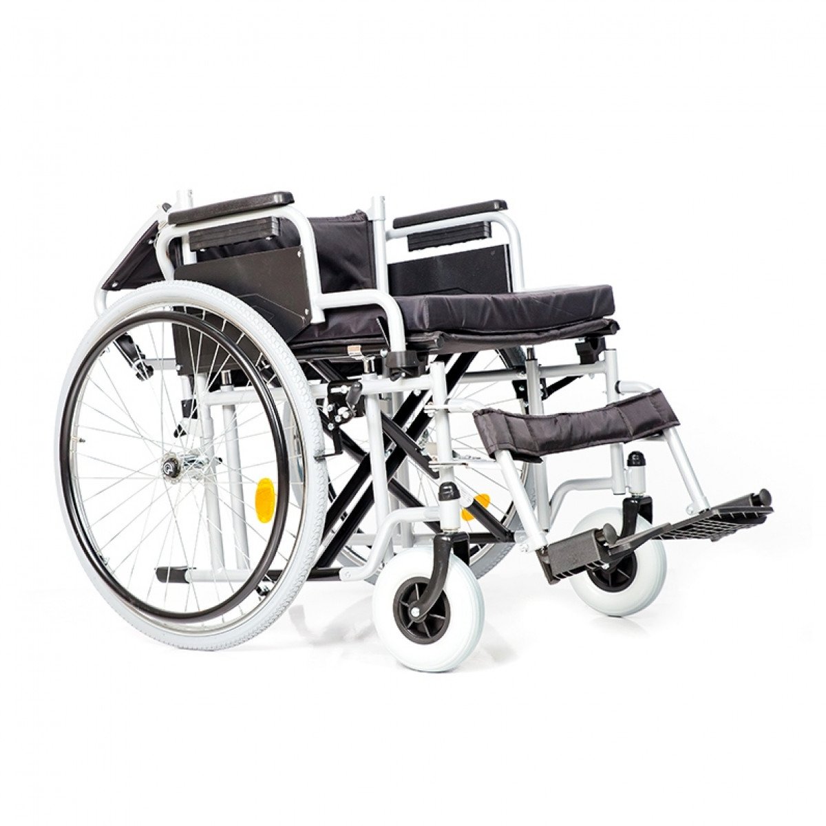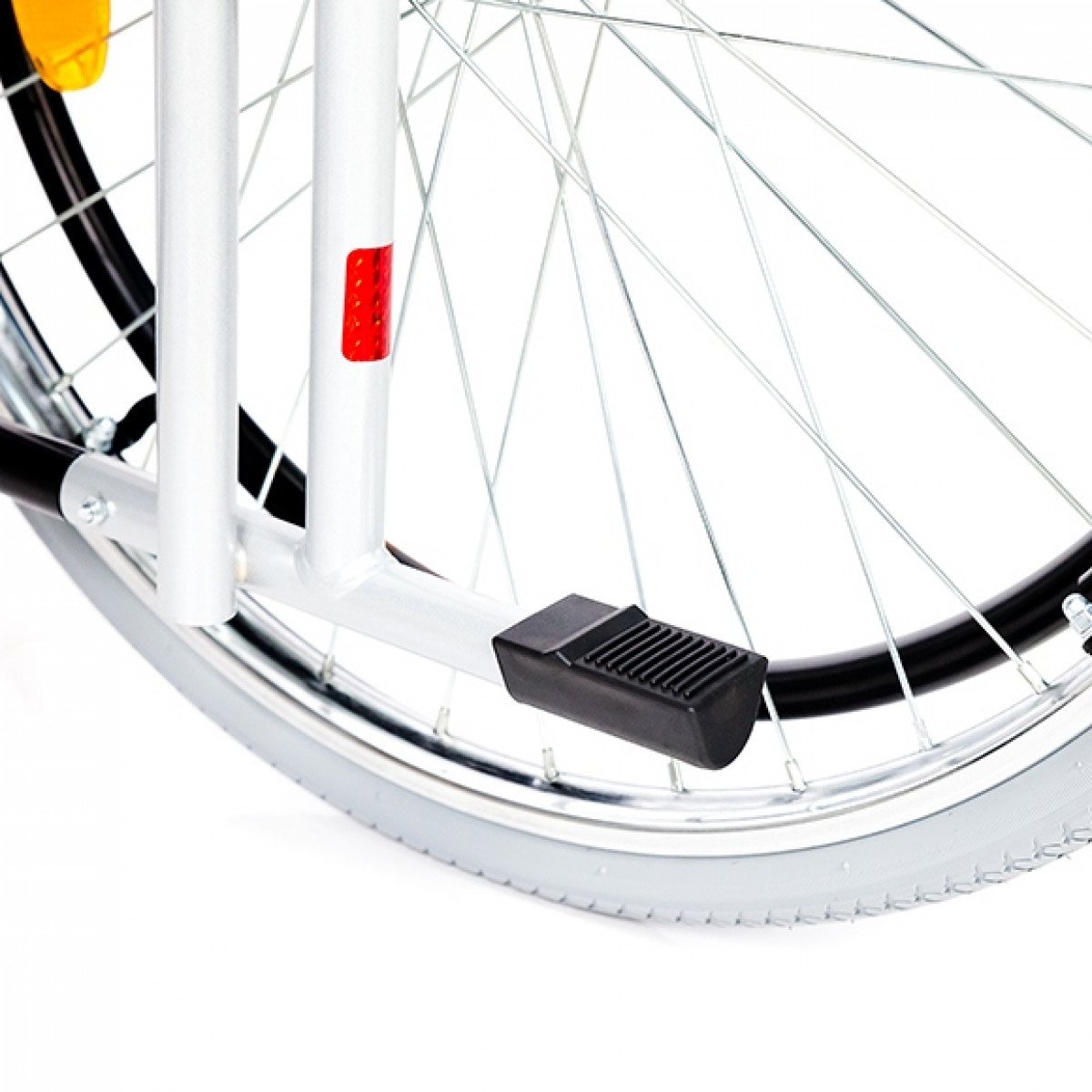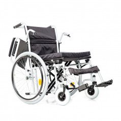 Задние колёса оснащены кнопочной системой быстрого снятия и доступны в двух вариантах: цельнолитые или пневматические. Обода с антискользящим покрытием облегчают управление, а стояночные тормоза с регулировкой глубины установки повышают контроль и безопасность. Подножки регулируются по высоте, снимаются или откидываются — это упрощает пересаживание и делает коляску более компактной при транспортировке.