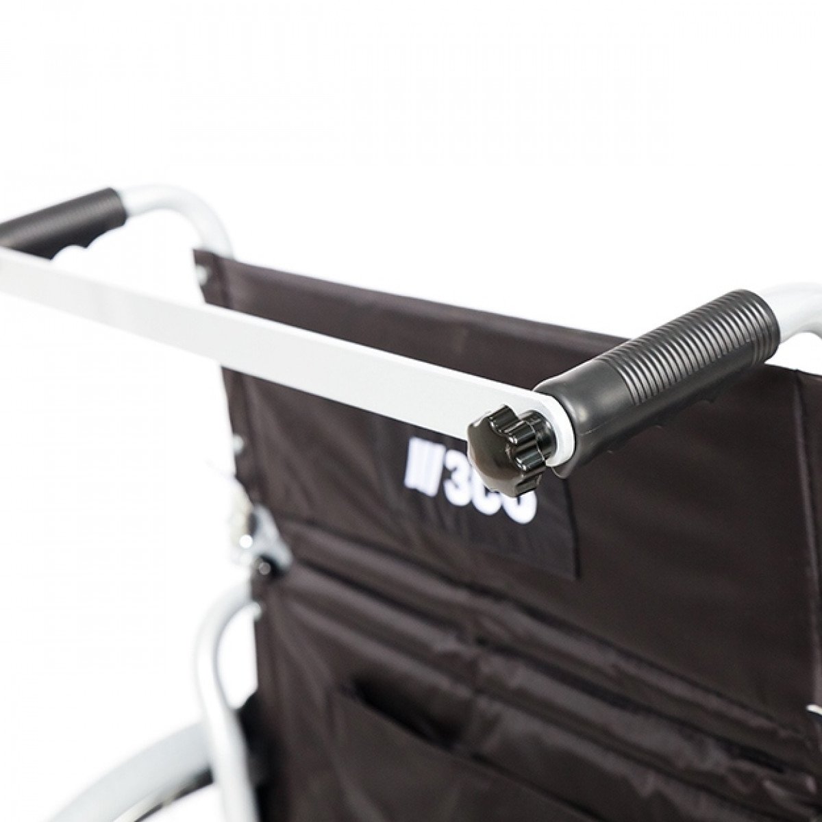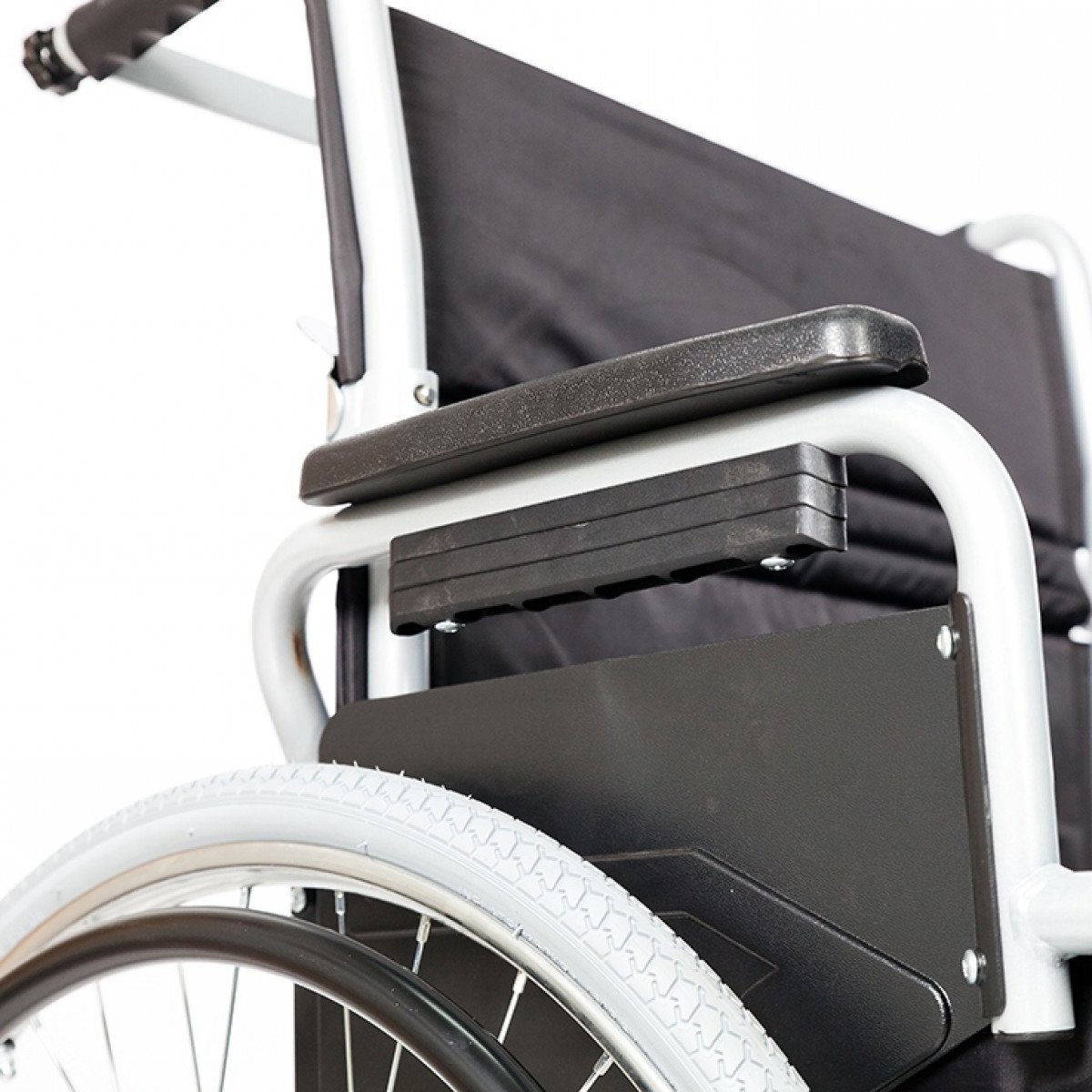 Модель быстро приводится в компактный вид без инструментов — достаточно откинуть подножки и поднять сиденье. Складная спинка упрощает хранение и перевозку. Подлокотники можно снять или откинуть, а их высота регулируется с помощью проставок — это позволяет точнее подстроить посадку под пользователя и сделать её удобнее.