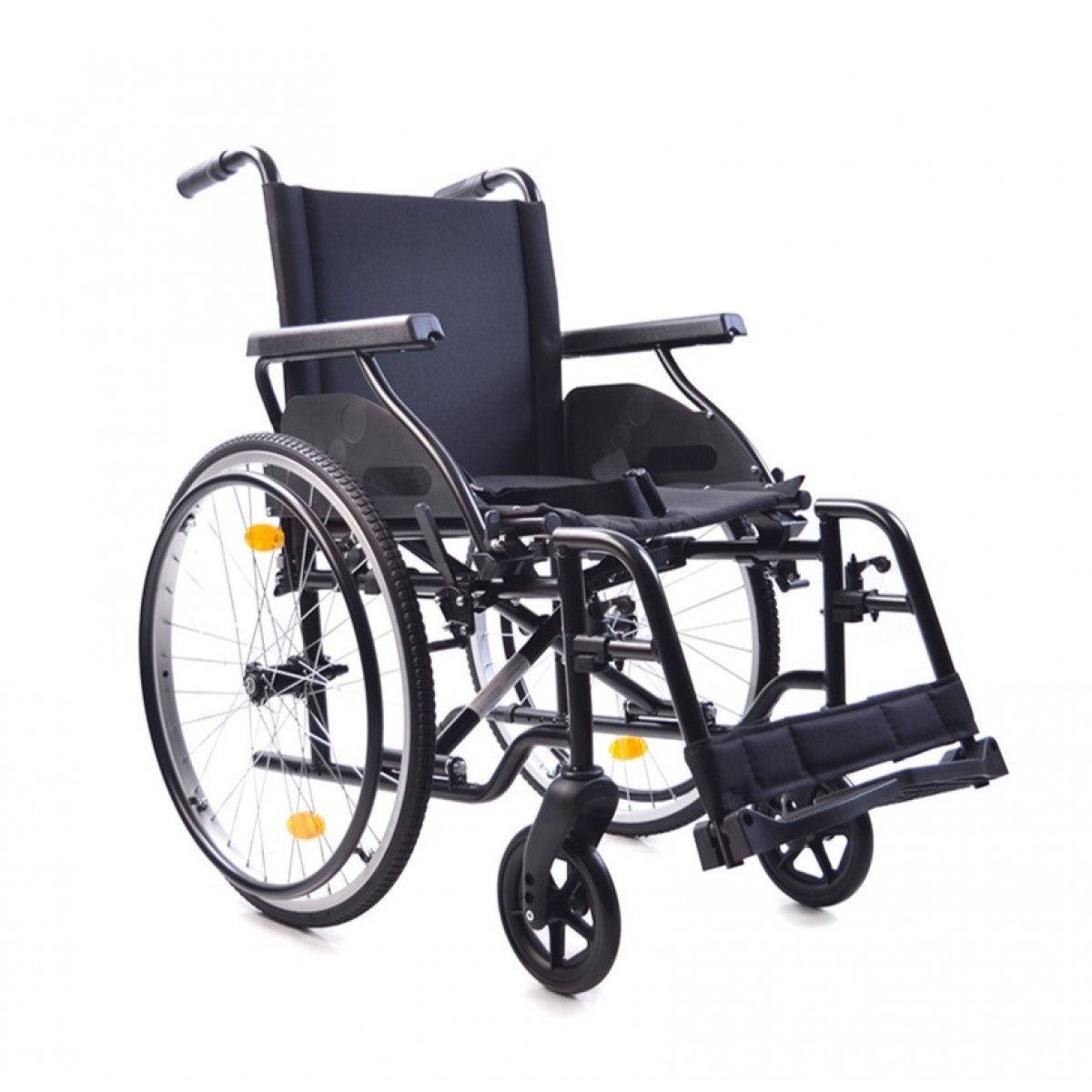 Коляска оснащена сиденьем с поясным ремнём для дополнительной фиксации и устойчивого положения. Подлокотники — съёмно-откидные, с защитными щитками, что упрощает пересаживание. Подножки регулируются по высоте, снимаются и откидываются, а ремень-упор для голени помогает правильно разместить ноги и снизить нагрузку.