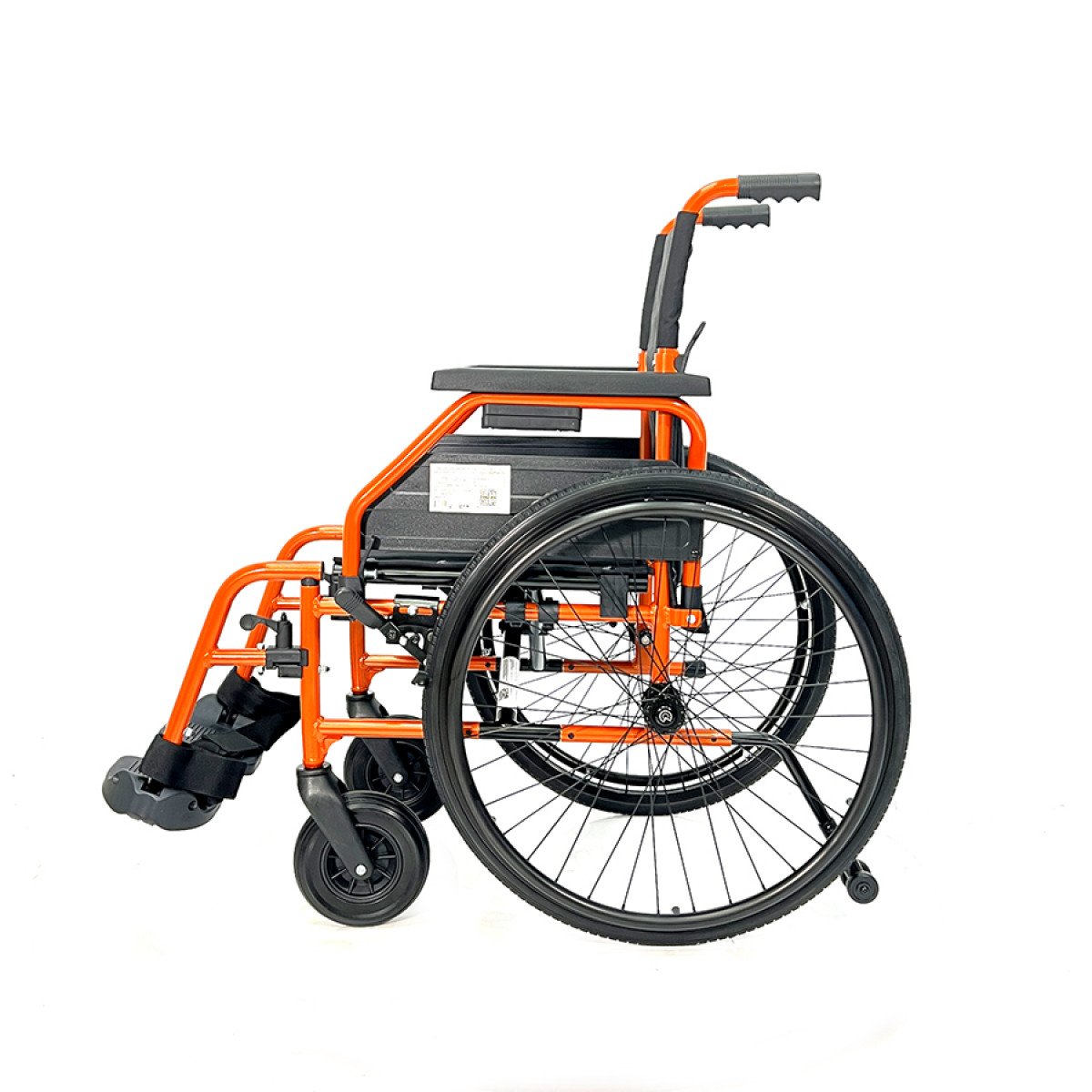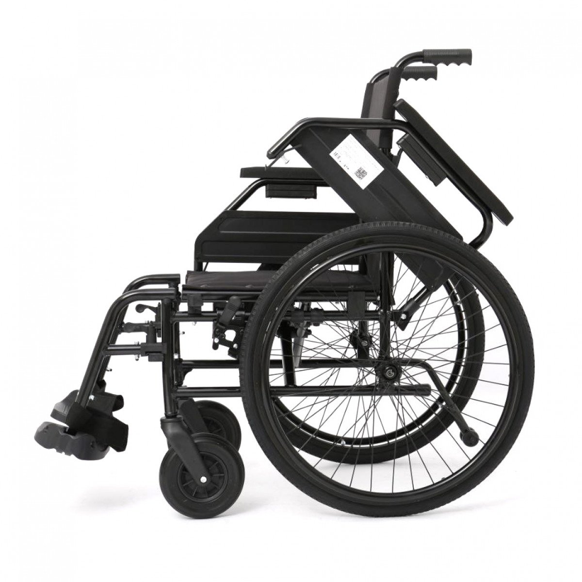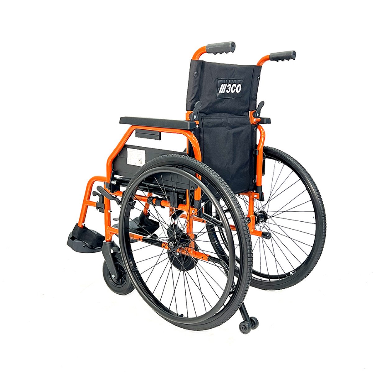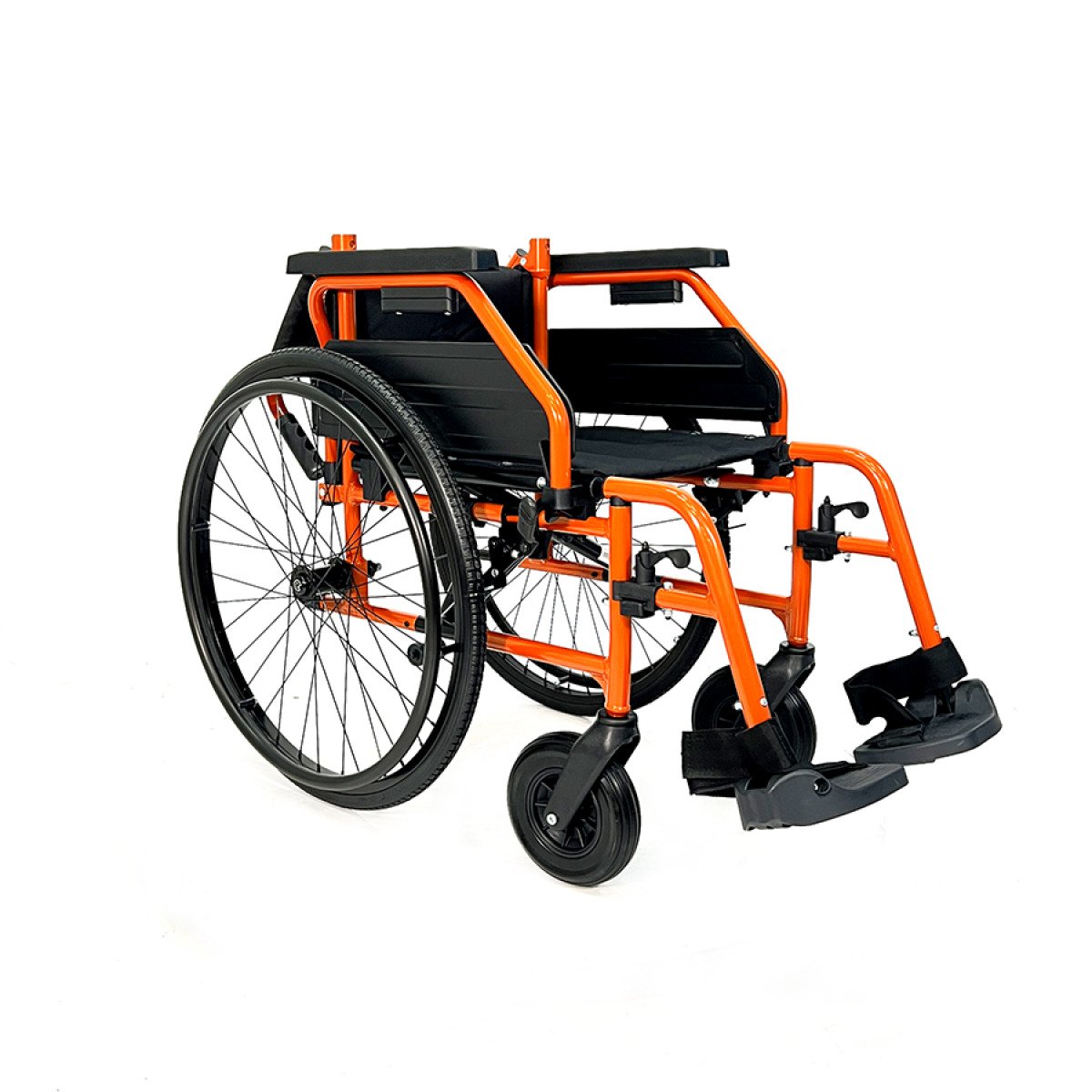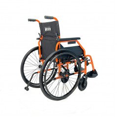 Рама выполнена из стальных труб с антикоррозийным покрытием — это про прочность и долговечность. Коляска складывается без инструментов, спинка также складная, что упрощает хранение и перевозку. Подлокотники откидываются и регулируются по высоте с помощью проставок, облегчая пересаживание и позволяя настроить удобную посадку. Подножки — съёмно-откидные, с регулировкой угла наклона, а ложементы под голени настраиваются по высоте для более правильного положения ног.