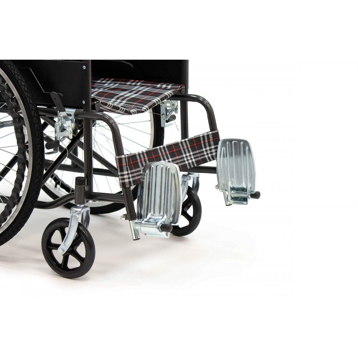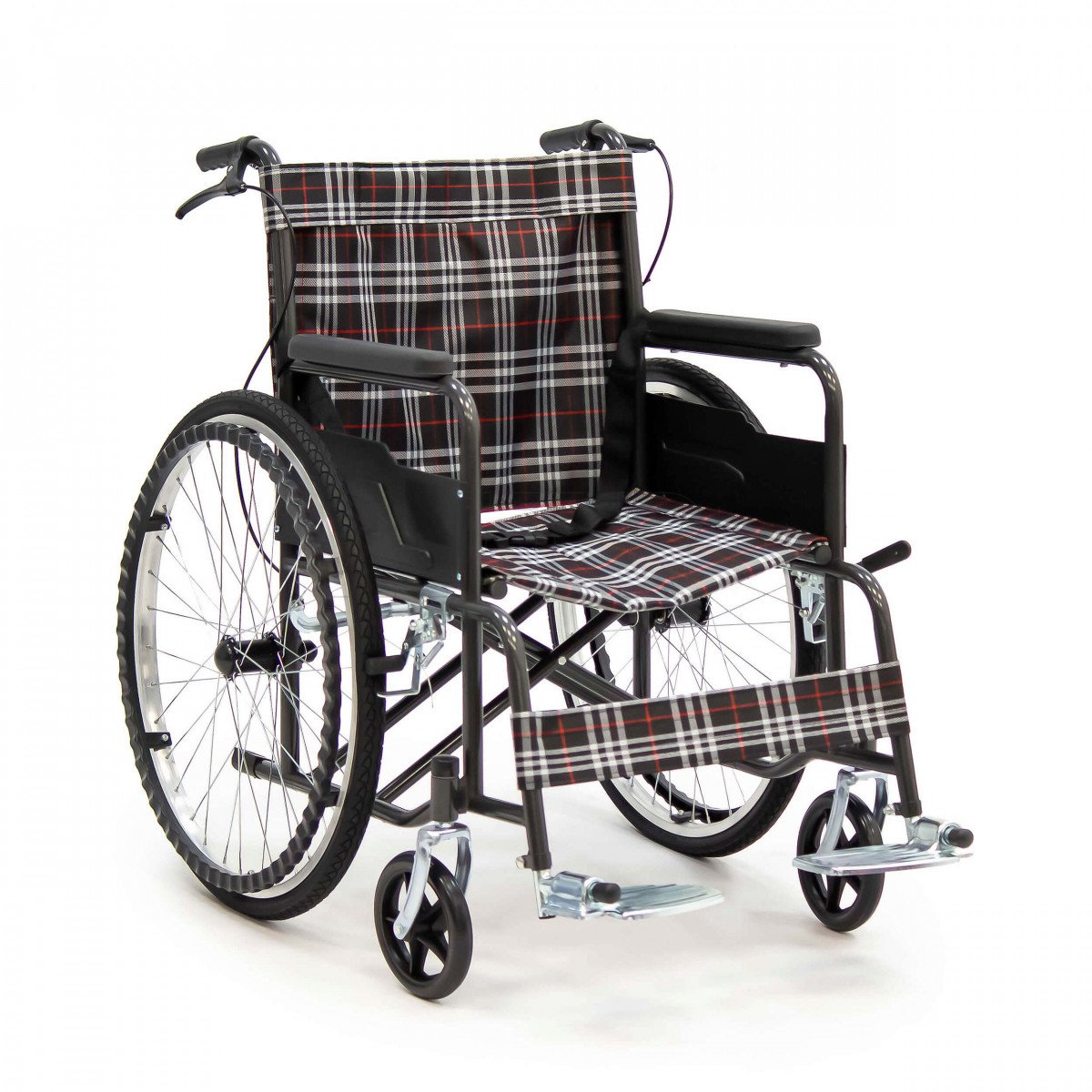 Конструкция простая и понятная в использовании. Сиденье выполнено из прочного полиэстера с водоотталкивающей пропиткой, подлокотники мягкие, а подножки регулируются по длине голени и дополняются поднимающимися опорами. Это позволяет настроить посадку и обеспечить комфортное положение пользователя. Рифлёные приводные обода упрощают управление, особенно если сила в руках снижена.