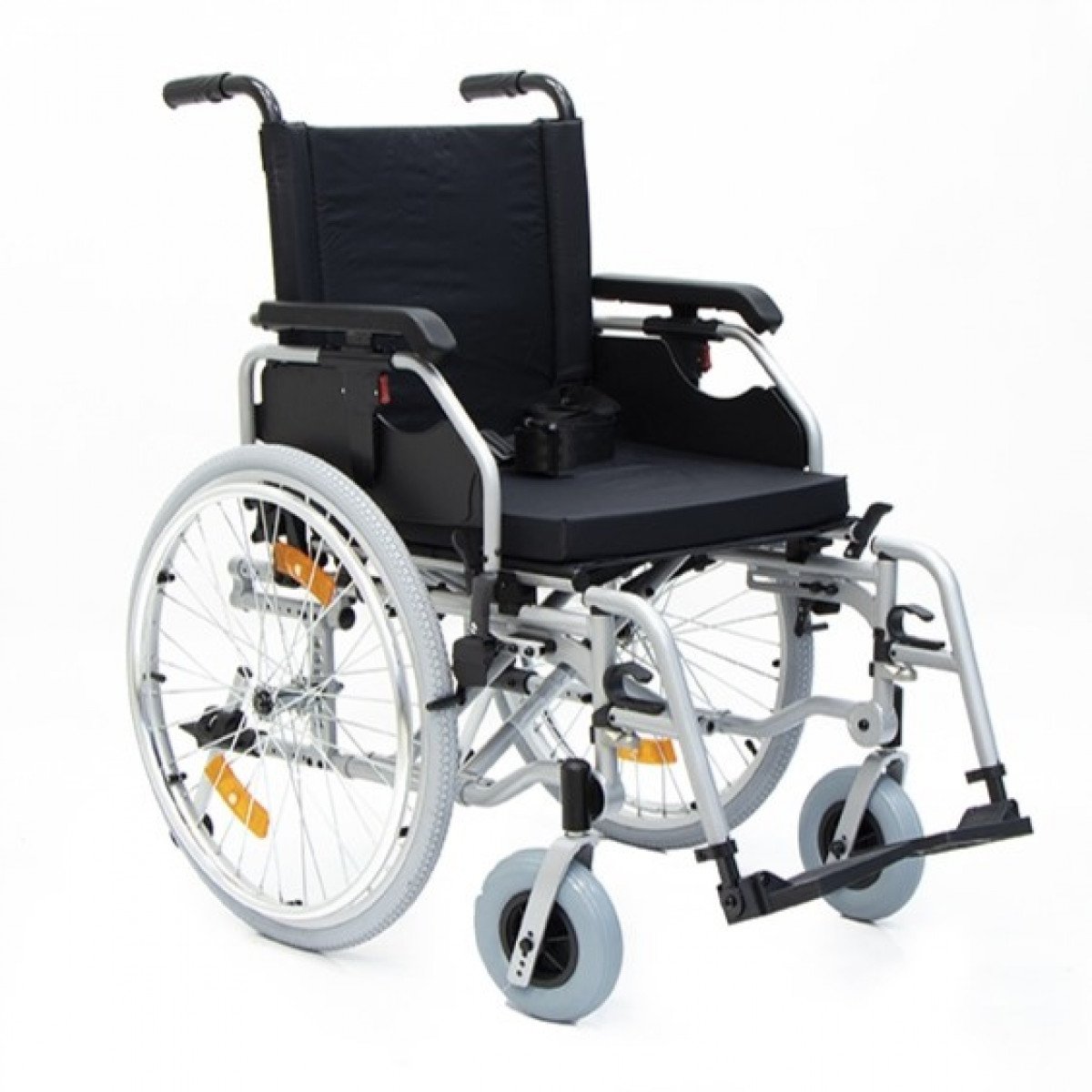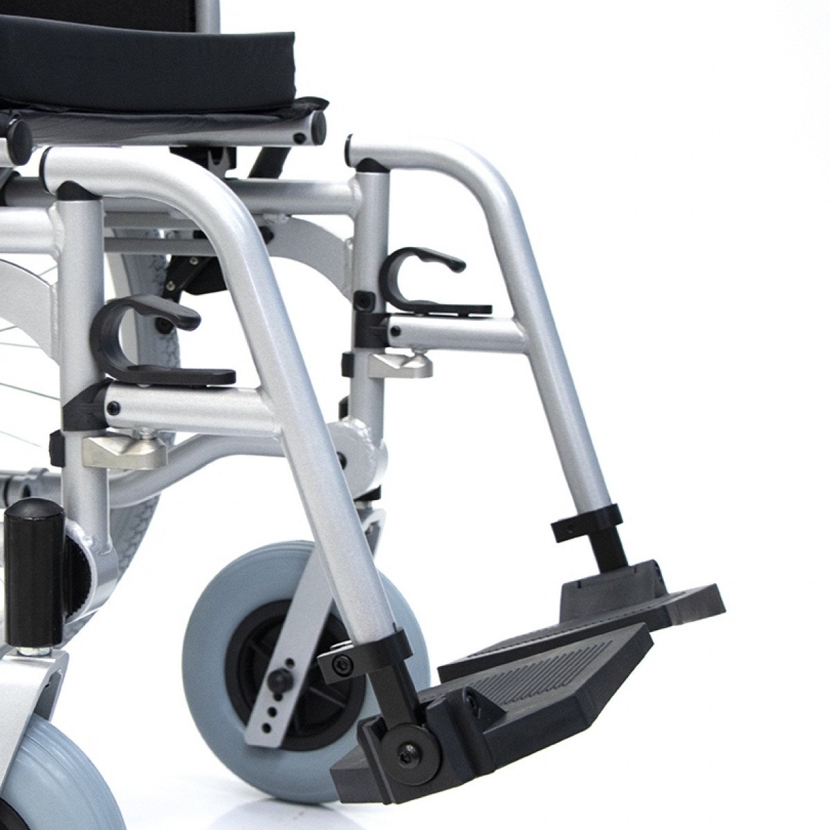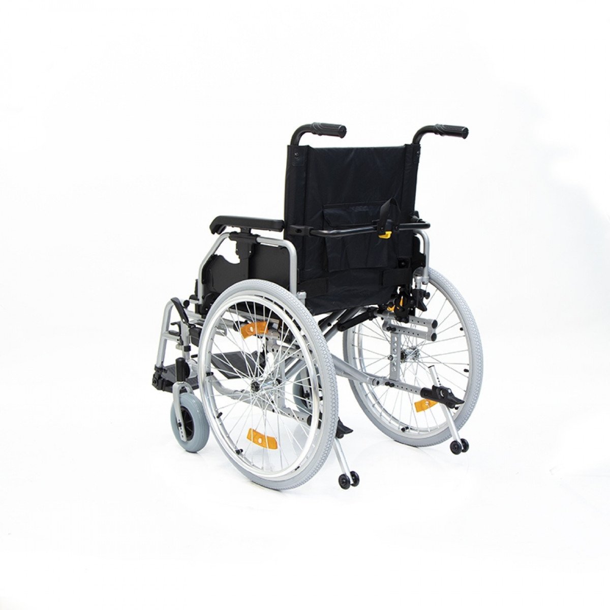 Коляска оснащена передними цельнолитыми колёсами с регулировкой по высоте и задними пневматическими колёсами, которые можно быстро снять и отрегулировать под пользователя. Складная рама из алюминия облегчает хранение и транспортировку. Для безопасности предусмотрены стояночные тормоза, жёсткая фиксация спинки и антиопрокидыватели с регулировкой, которые повышают устойчивость при движении.