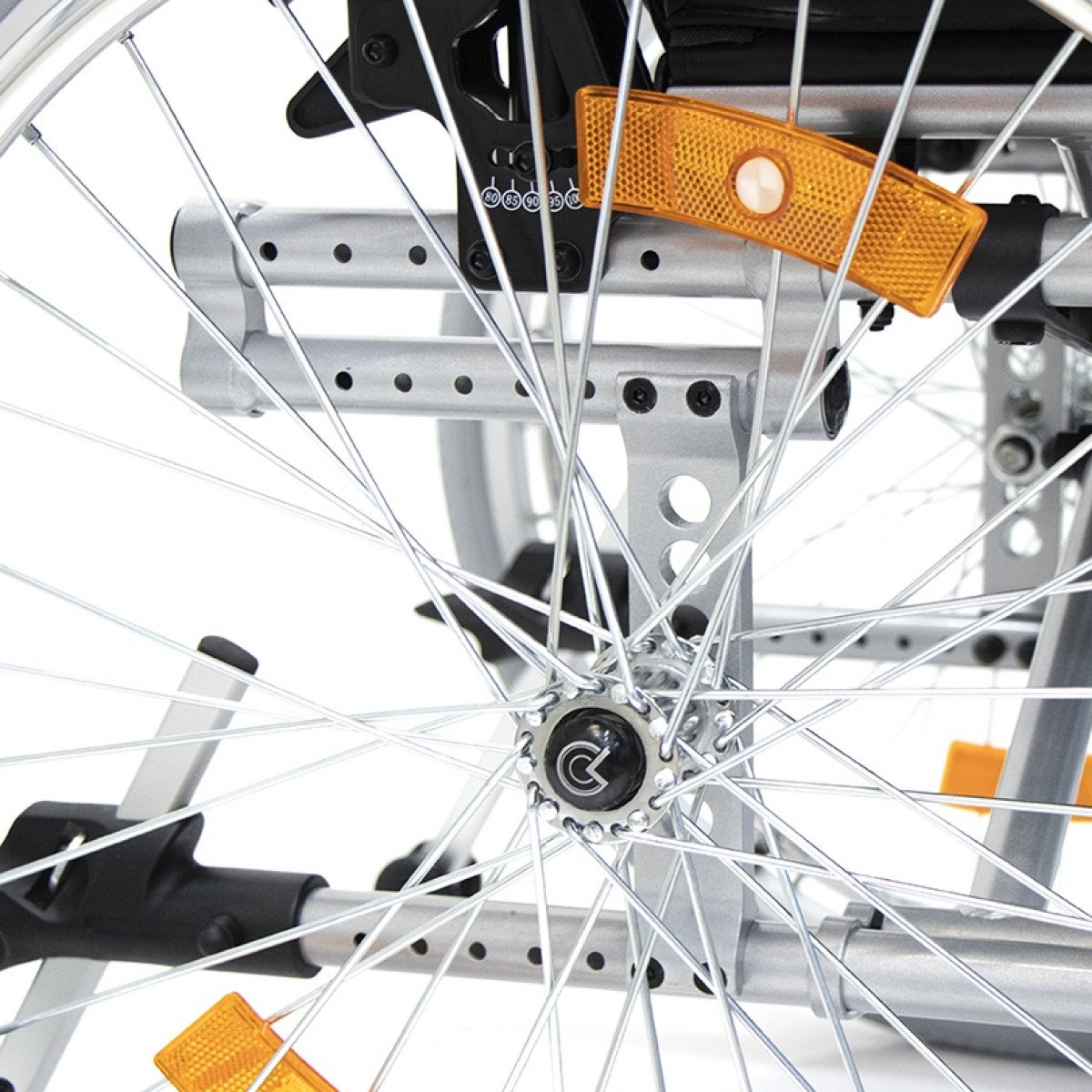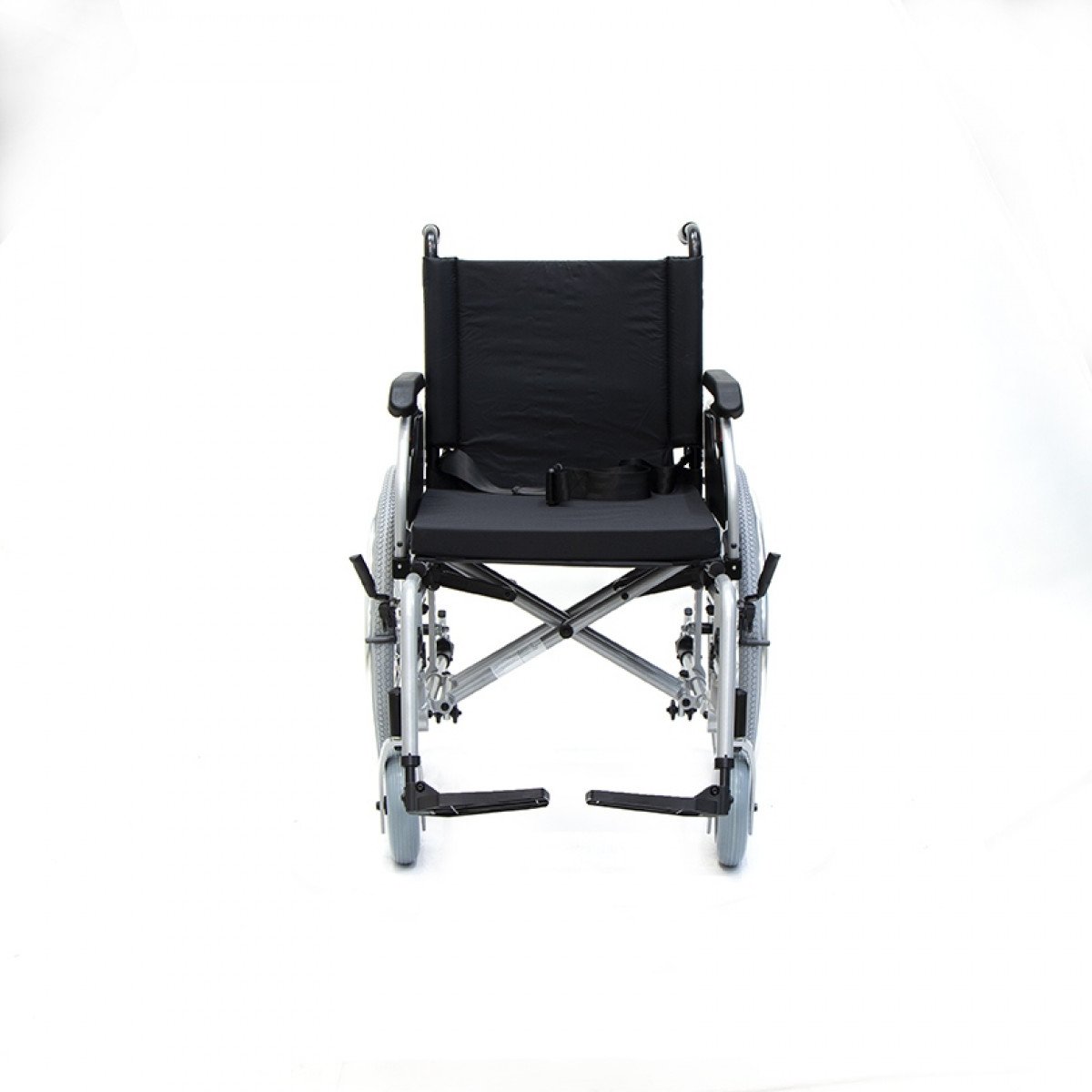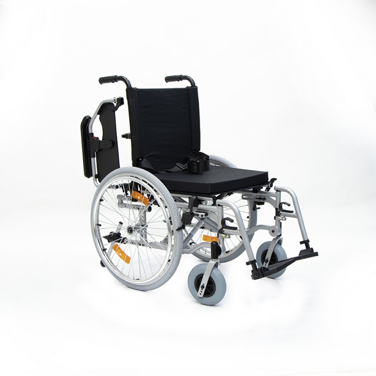 Коляска оснащена передними цельнолитыми колёсами с регулировкой по высоте и задними пневматическими колёсами, которые можно быстро снять и отрегулировать под пользователя. Складная рама из алюминия облегчает хранение и транспортировку. Для безопасности предусмотрены стояночные тормоза, жёсткая фиксация спинки и антиопрокидыватели с регулировкой, которые повышают устойчивость при движении.