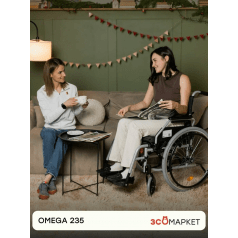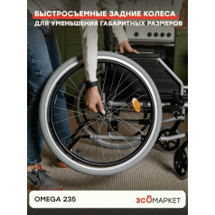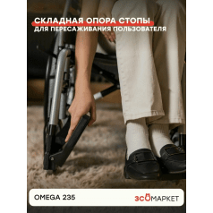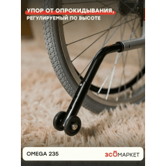 Omega 235 легко настраивается: приводные колёса регулируются по положению, подлокотники можно отрегулировать по высоте или снять для удобного пересаживания. Передние колёса также регулируются по высоте, что помогает точнее подстроить посадку. Подножки — съёмные, откидные, с регулировкой, упрощают посадку и делают коляску компактнее при перевозке.