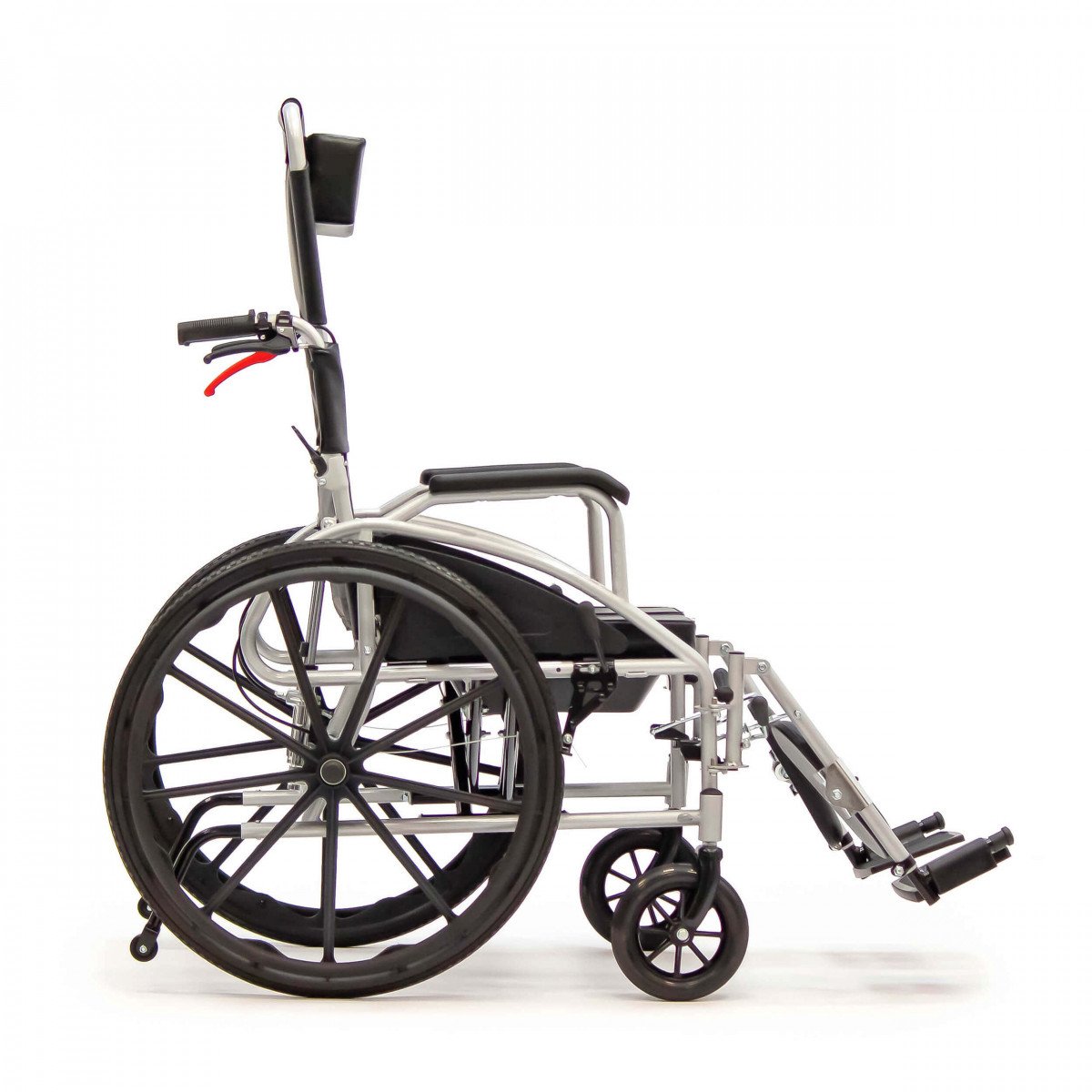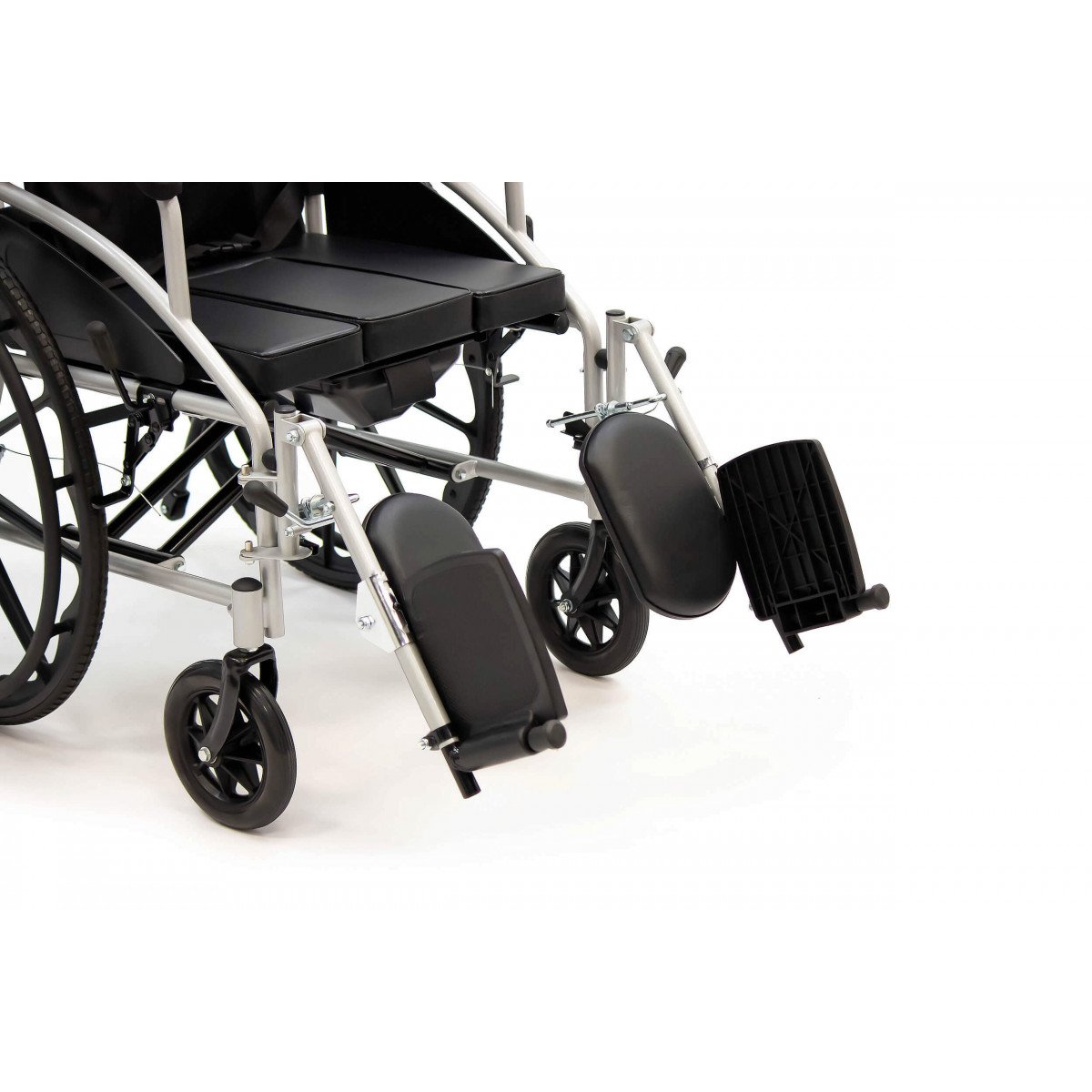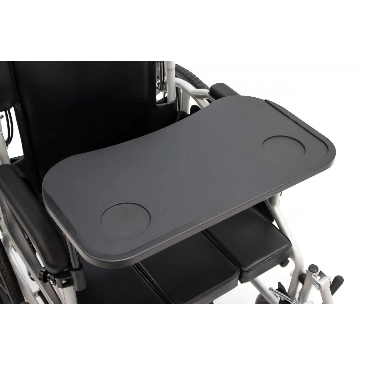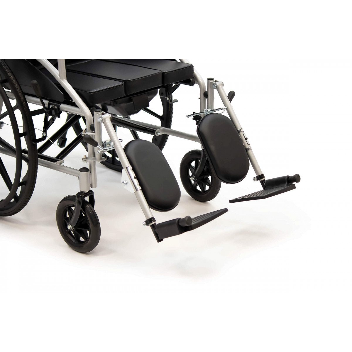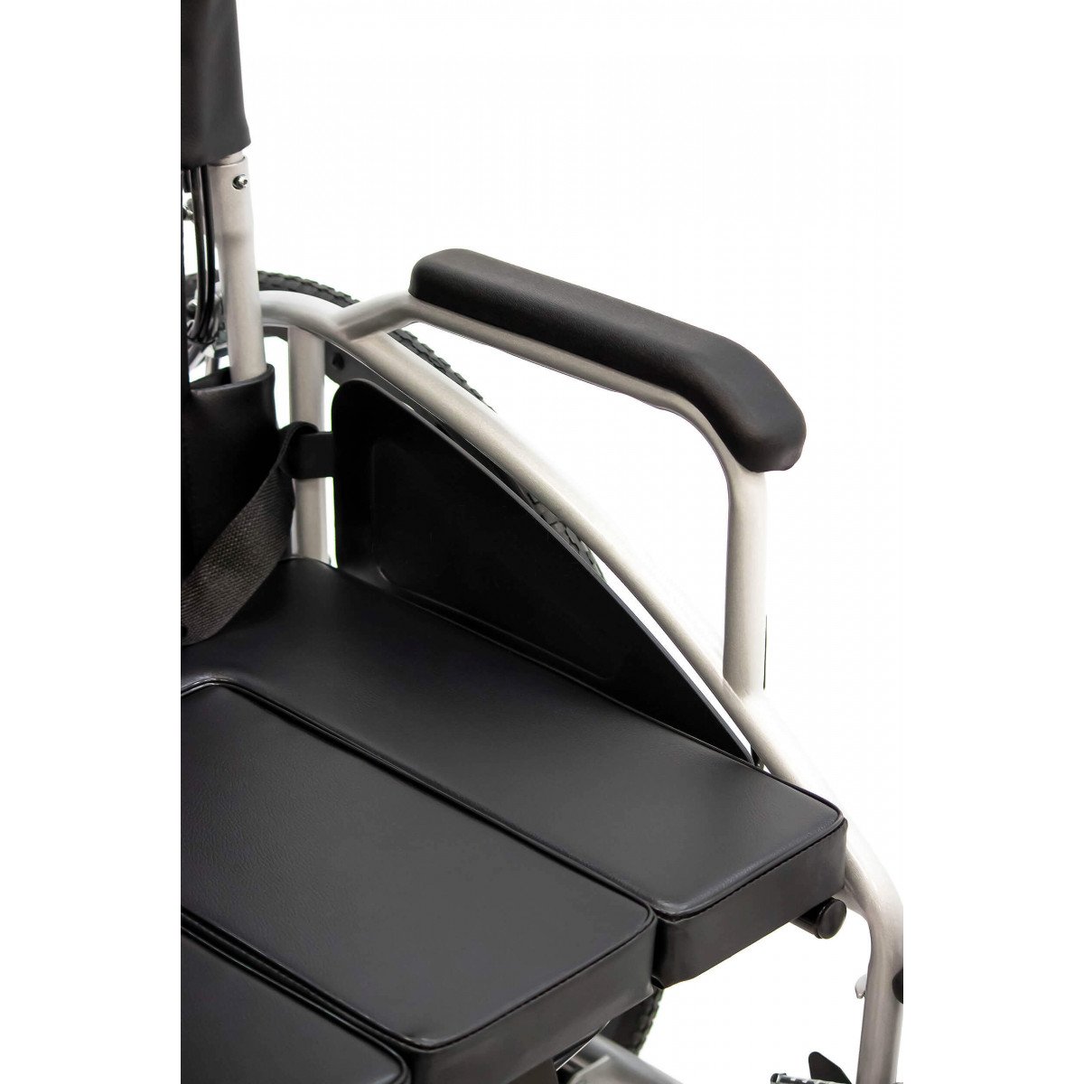 Сиденье из кожзаменителя легко очищается и подходит для регулярного ухода. Встроенное санитарное оснащение упрощает повседневные процедуры, а рифлёные обода облегчают управление. Модель продумана для пользователей с ограниченной подвижностью и тех, кому требуется больше поддержки в течение дня.