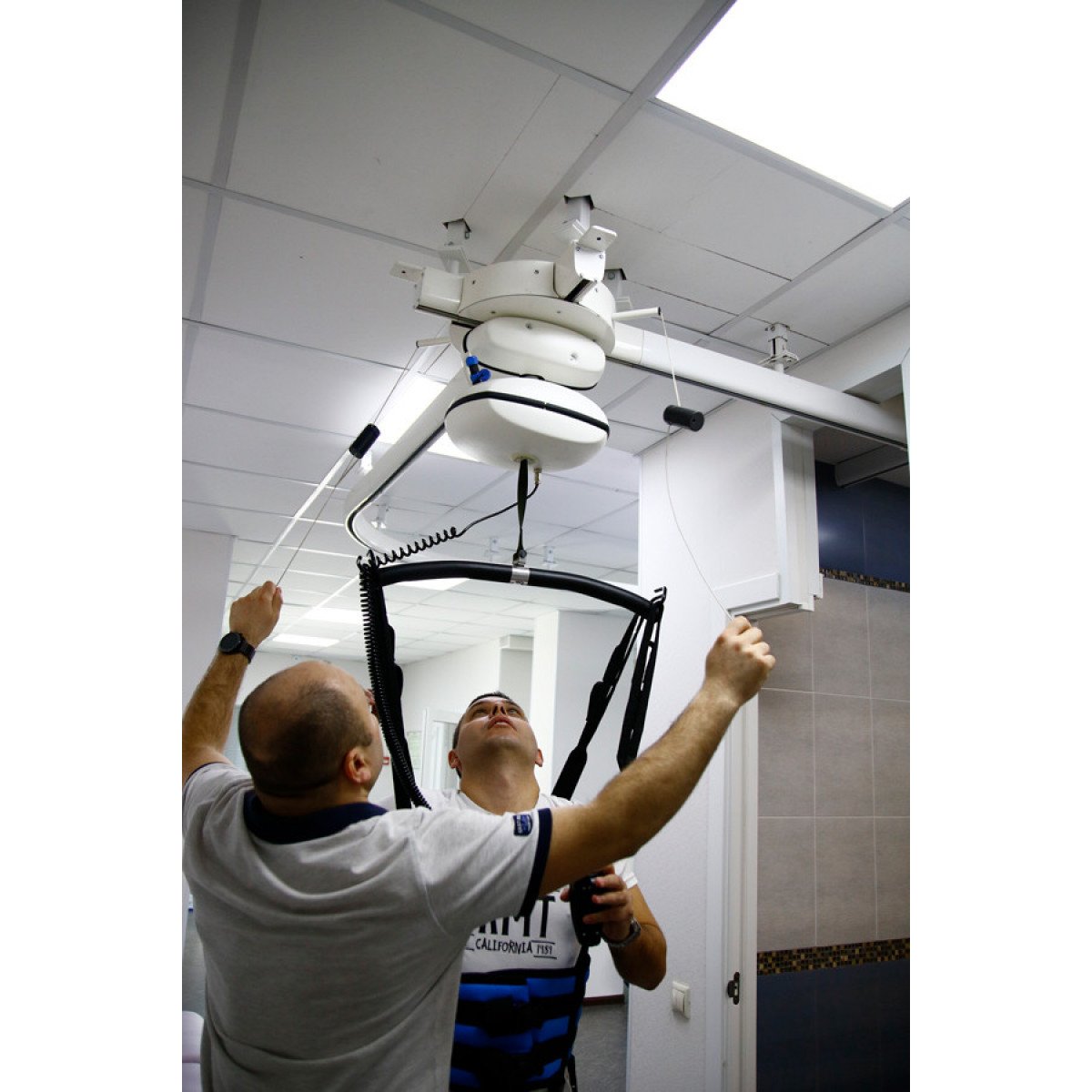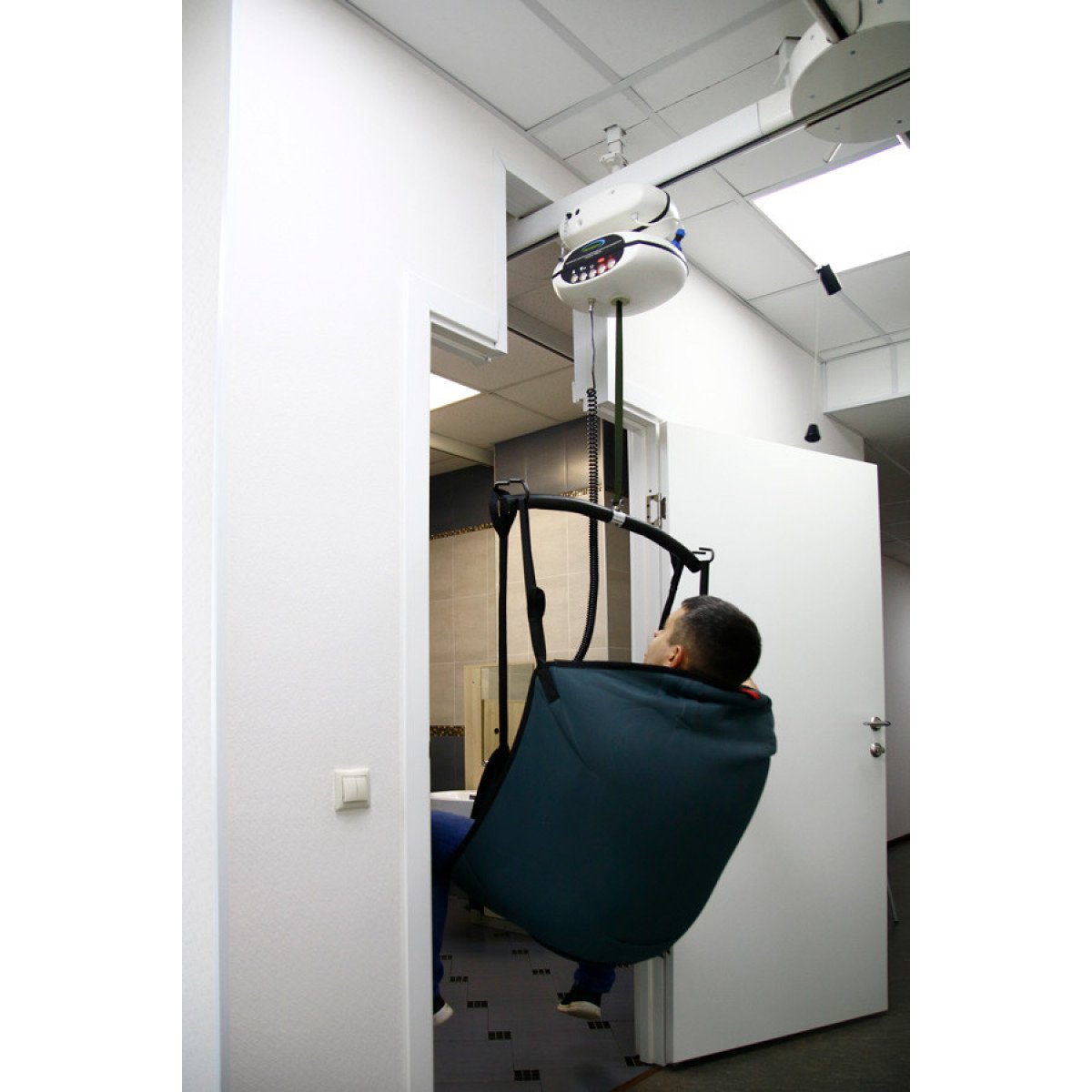 Рельсы могут устанавливаться на потолке или стенах и охватывать любое пространство — от отдельной зоны до всего помещения. В зависимости от конфигурации система работает как прямой монорельс, позволяющий перемещать пациента между двумя точками, либо как траверсная система — когда подвижная перекладина двигается по рельсам и позволяет свободно перемещаться по всей комнате. Управление подъёмом и перемещением остаётся простым и безопасным: это может делать и персонал, и сам пользователь, если это позволяет его состояние.