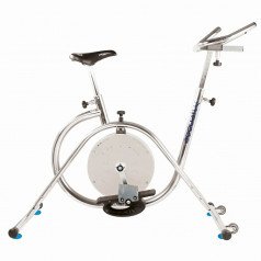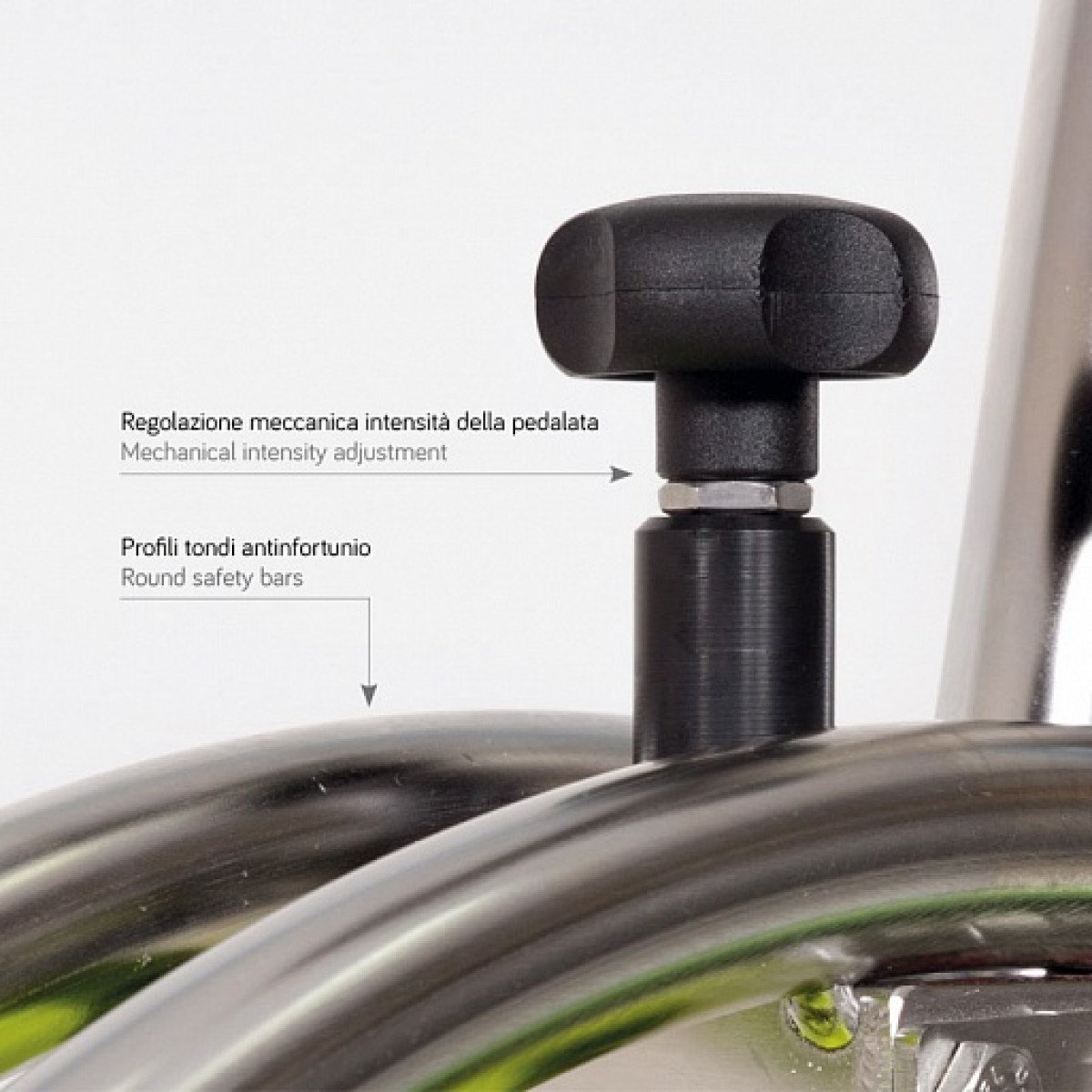 Нагрузка регулируется механически: система сопротивления доработана так, чтобы велосипед уверенно тормозил при увеличении усилия. Педали со специальной формой создают дополнительное сопротивление воды, увеличивая нагрузку на мышцы, а широкие платформы для стоп позволяют комфортно заниматься даже без обуви. Посадка выстроена за счёт фиксированного угла 74° между седлом и рулём — горизонтальная настройка седла не требуется.