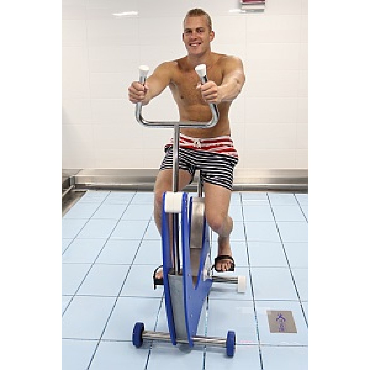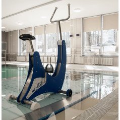 Конструкция тренажёра выполнена из медицинской нержавеющей стали и прочного пластика, устойчивых к постоянному контакту с водой. Высота сиденья и упоров для рук регулируется под рост пользователя. Для удобства перемещения предусмотрены роликовые колёсики, а устойчивость на дне бассейна обеспечивают резиновые опоры. Надёжное решение для частных и реабилитационных бассейнов, где важны безопасность, долговечность и результат.