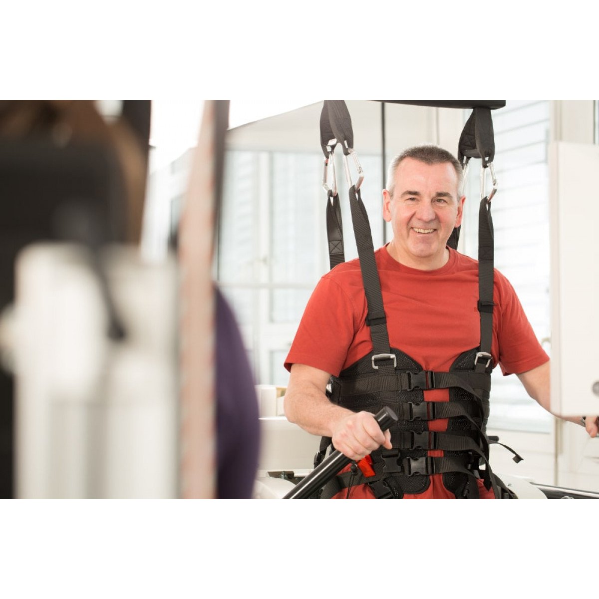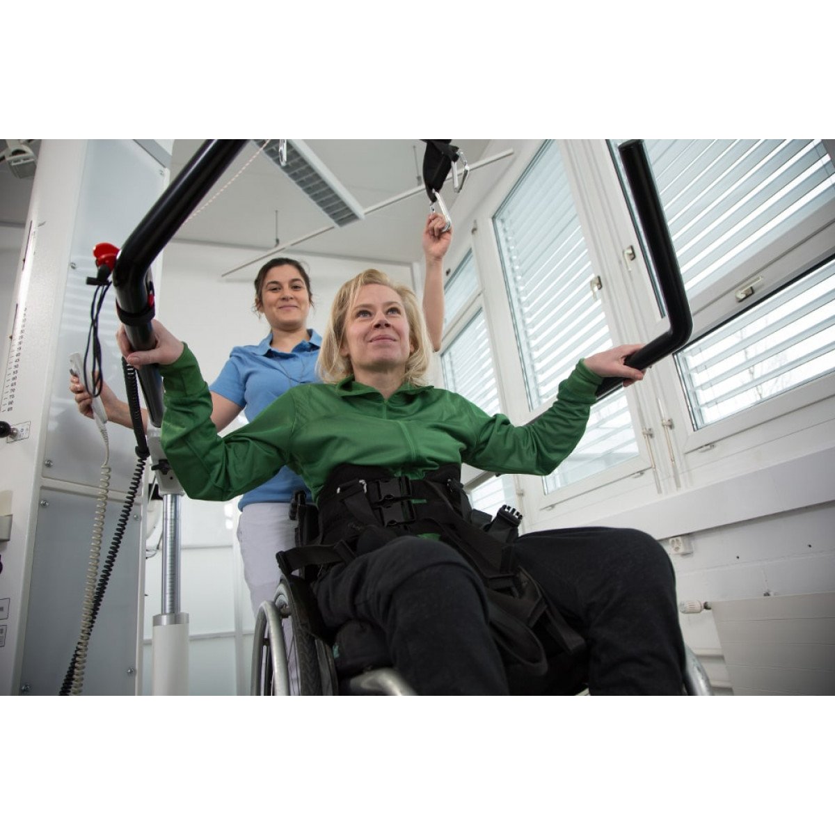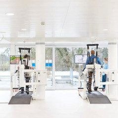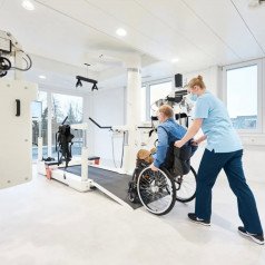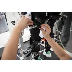Пользователи в инвалидных креслах могут быть переведены в вертикальное положение и закреплены с помощью специальных фиксаторов, что облегчает процесс реабилитации. LokomatPro также оснащён встроенными датчиками силы для каждого сустава, что позволяет точно настроить интенсивность механической ассистенции для каждой конечности в реальном времени.